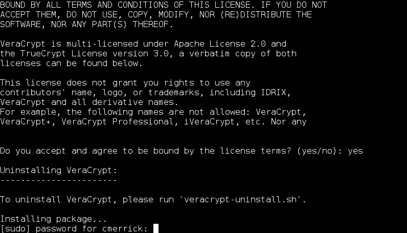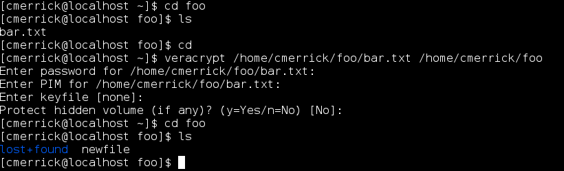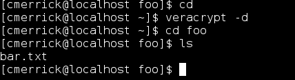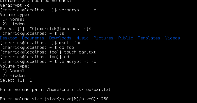Now that Veracrypt is installed, it can be run anywhere to create encrypted file containers. To begin, use the touch command to create a file that will be converted to an encrypted file container. For example, bar.txt will become an encrypted file container, located on the path /home/cmerrick/foo/bar.txt