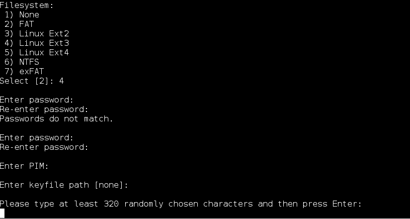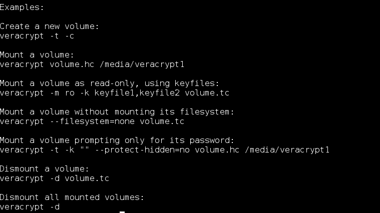 To begin, use veracrypt -c . It will ask several questions about what type of container you want to use, what form of encryption, what file system to use. Make sure to put the entire path to the container you wish to create. It will then prompt you to enter a passphrase twice, the longer the passphrase the more secure the container.